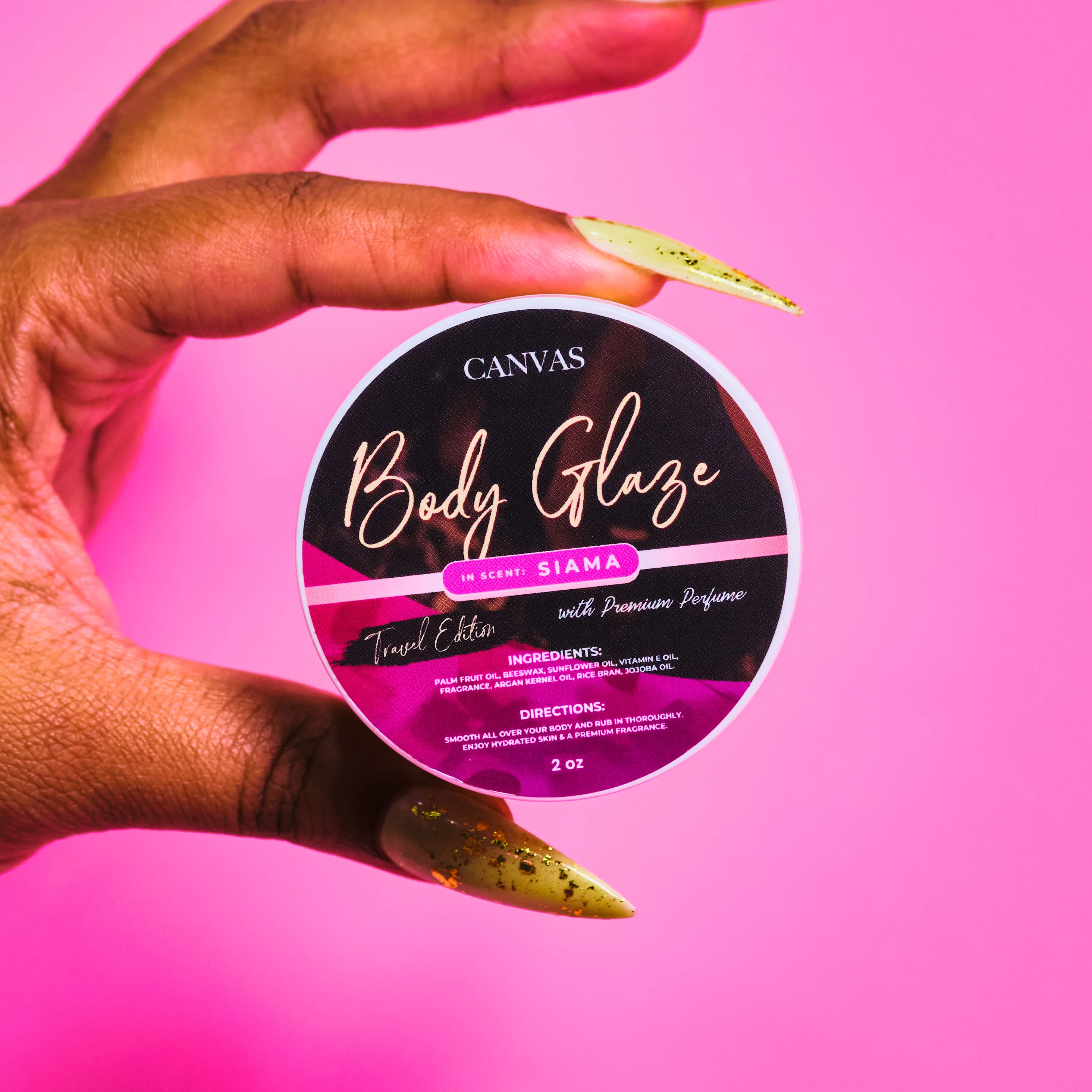 Body Glaze is loaded with significant benefits. This organic anti-aging formula is packed with antioxidants thanks to the star ingredient PALM FRUIT OIL. It leaves skin soft and glossy without being greasy. It tightens the skin and prevents sagging and wrinkling. Once you’ve been glazed you’ll never want to be dry again. It’s the ultimate icing for your skin. The texture is creamy and silky. It melts in your hand the way a glazed doughnut melts in your mouth.